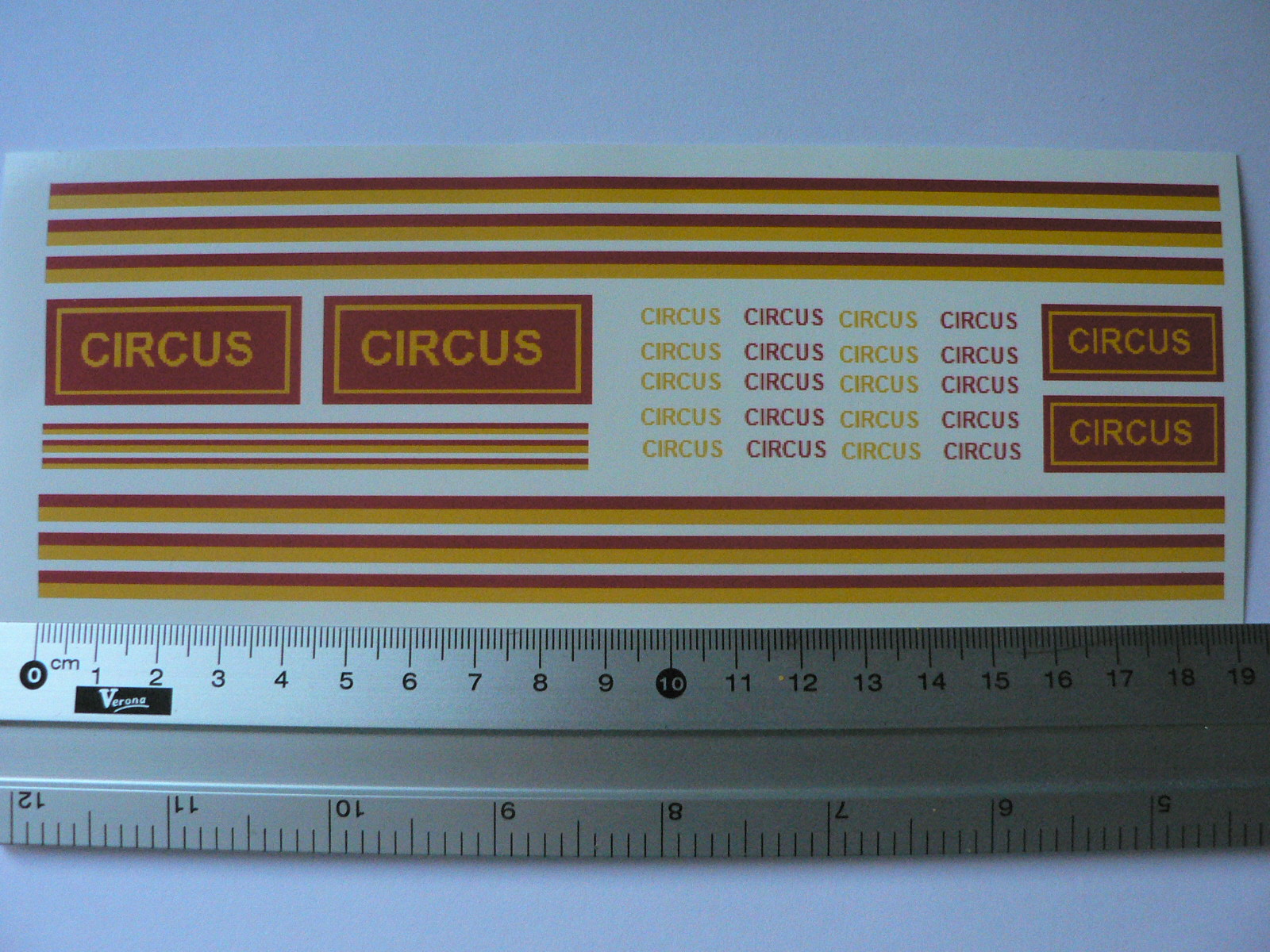 Circus tekst + strepen water transfer decals Kleuren rood en geel